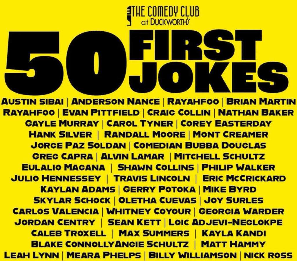 The Comedy Club at Duckworth’s marks its first anniversary with 50 First Jokes, a one-night-only comedy showcase featuring 50 comedians, each sharing their first brand-new joke of the new year. The fast-paced format gives every comic a moment on stage to debut fresh material. Originally launched in New York in 2007, 50 First Jokes has grown into an annual event in cities across the country, celebrating the comedy community while offering audiences a rare, behind-the-scenes look at how new jokes are born.