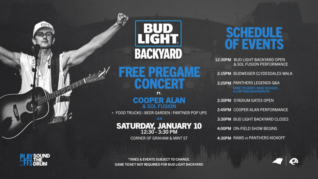 The Panthers have announced pregame festivities for Bud Light Backyard, which will expand down Mint and Graham streets and open at 12:30 p.m. ahead of kickoff. The fan zone will feature activations from Bojangles, Bud Light, Budweiser, Coca-Cola, GMC, Michael & Son, Catawba Two Kings, Whataburger, and Wicked Weed, highlighted by a 2:45 p.m. concert headlined by Carolina native country singer Cooper Alan. Fans can catch the iconic Budweiser Clydesdales parading around Bank of America Stadium at 2:15 p.m. (weather permitting) as Budweiser celebrates its 150th anniversary. The Team Store will also be open pregame and postgame.