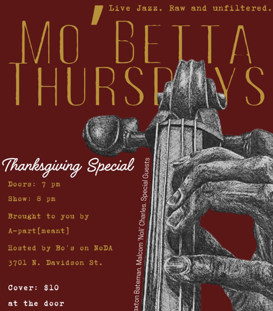 Mo’ Betta Thursdays is a weekly jazz experience curated by Braxton Bateman in collaboration with A-part[meant]. Hosted at Bo’s on NoDa, the series showcases some of Charlotte’s finest musicians, blending jazz, R&B, soul, and hip-hop through dynamic live improvisation and genre-bending grooves.