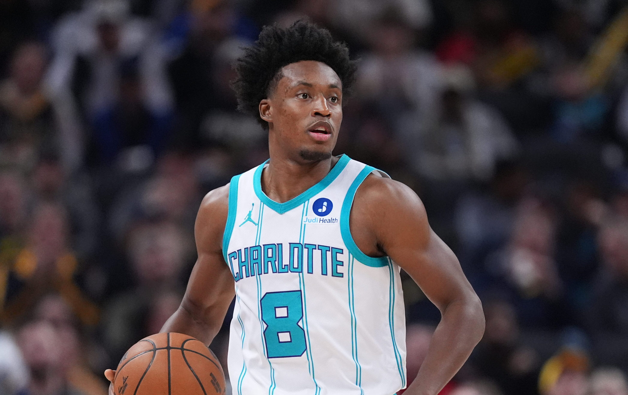 Charlotte Hornets guard Collin Sexton (8) plays against the Indiana Pacers during the first half of an NBA basketball game in Indianapolis, Wednesday, Nov. 19, 2025. (AP Photo/Michael Conroy)