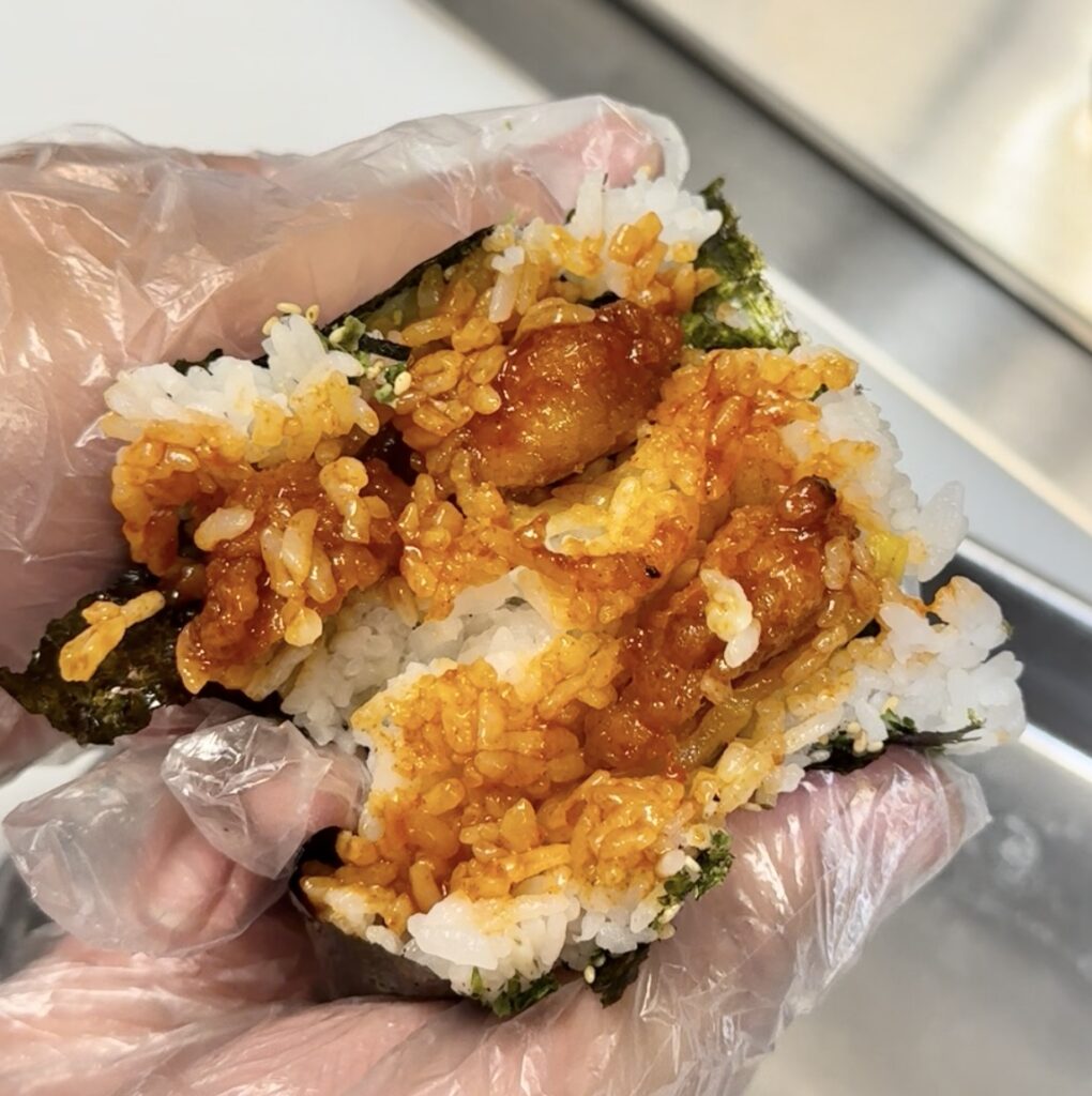 Oni Stop offers traditional fillings like spicy tuna and salmon, but their Korean-inspired flavors — fried chicken doused in gochujang and topped with a slice of danmuji or takuan (yellow pickled daikon), or kimchi-filled options — are a must-try. Their tempura shrimp and seaweed options provide crunchier textures, while breakfast varieties with bacon, egg, and Spam offer more traditional American flavors. With multiple protein options — including imitation crab, commonly used in Korean kimbap — there’s a wide array of filling combinations.